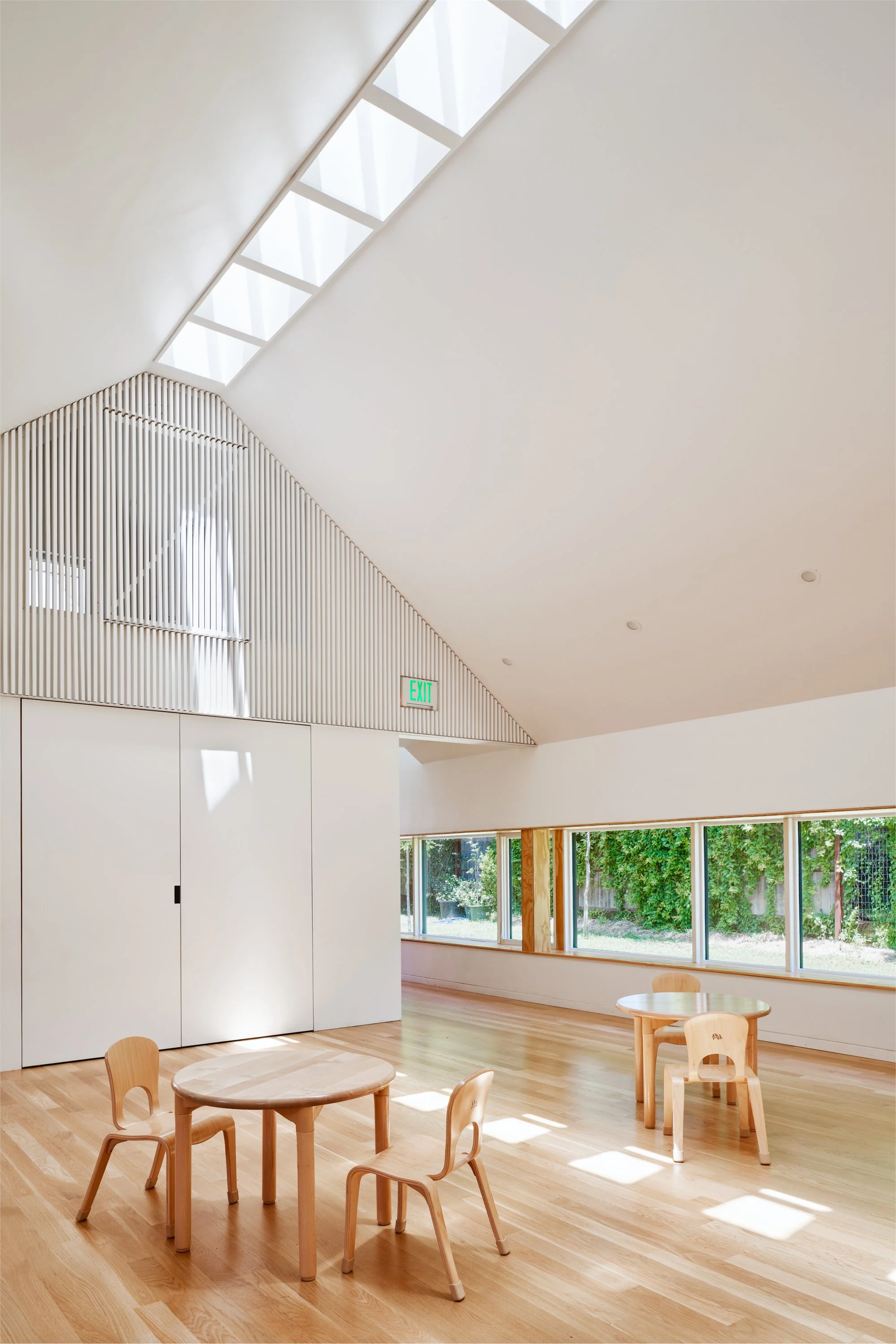 This addition to the Little Tiger Chinese Immersion School campus is nestled behind an existing 1940s bungalow in Central Austin. The building draws inspiration from historic one-room schoolhouses with its iconic gable form and belfry. The form is specifically scaled for children, featuring low eaves, child-height windows, and continuous skylight with vertical light baffles for optimal daylighting.